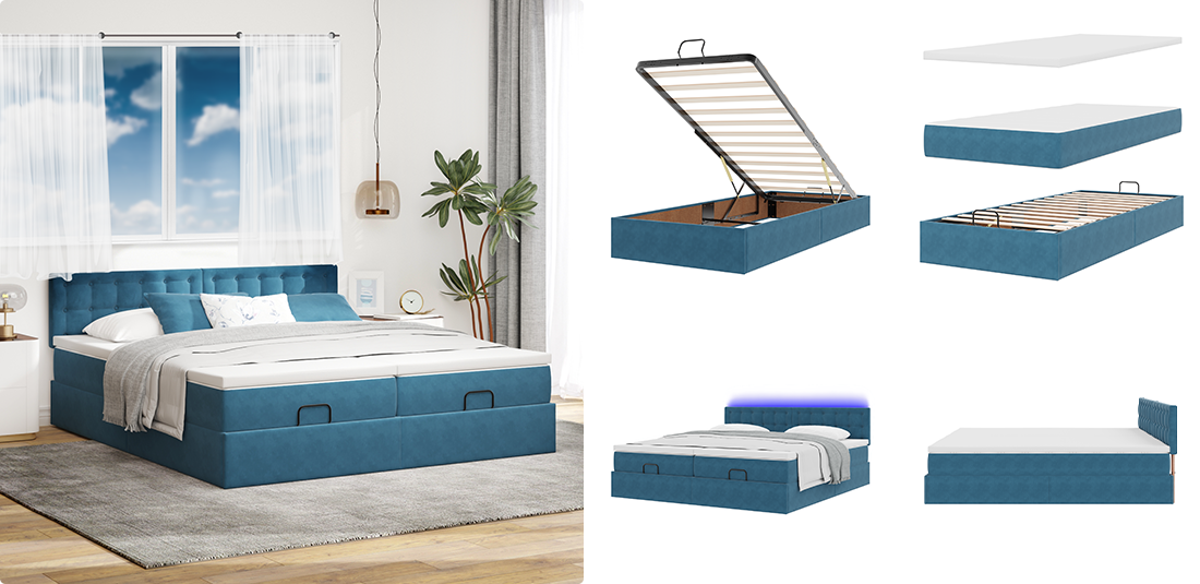 Profitez d'un meilleur repos et d'un plus grand confort grâce à notre nouvelle collection de lits. Nos lits ottomans offrent un rangement spacieux et un accès facile grâce à un système de levage hydraulique, idéal pour les petits espaces. Pour un sommeil plus réparateur, découvrez nos ensembles de sommiers en velours, qui comprennent un matelas à ressorts ensachés pour un soutien personnalisé et un surmatelas moelleux pour plus de confort. Tout ce dont vous avez besoin pour passer une bonne nuit de sommeil, vous le trouverez dans notre dernière gamme.
